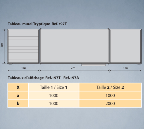 Tableau Mural revêtue Ardoisée, couleur verte ou noire, structure renforcée avec les rives protégées par des alèses *Fixation par crochets *Porte-craies intégré.Tableau blanc pour écriture aux stylos effaçables, cadre en aluminium, porte-stylo intégré.Tableau d'affichage en liège, encadrement en bois.